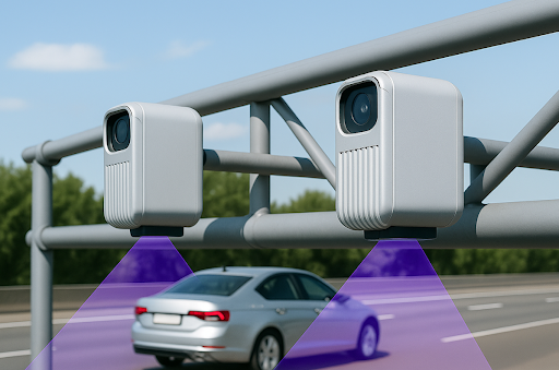 - Veículo passa por pórtico com câmeras e sensores;